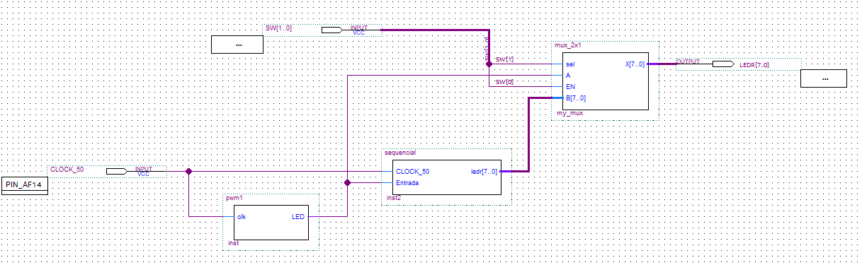 Faça o VHDL de um mux 2x1 com enable (liga ou desliga a saída), transforme em bloco em faça o circuito abaixo: